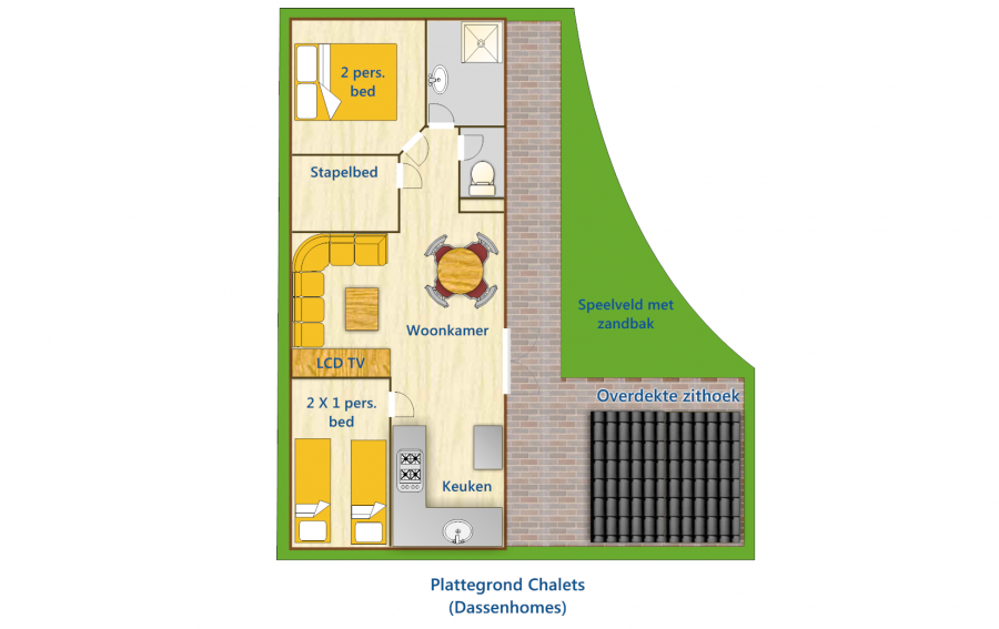 Onze chalets (Dassenhomes) zijn volledig ingericht met 3 slaapkamers, douche, toilet, LCD TV en een ruime keuken. De woonkamer bevindt zich in het midden van de chalet. De chalets liggen dicht bij het centrum, het zwembad, het motorikpark en de grote speeltuin.